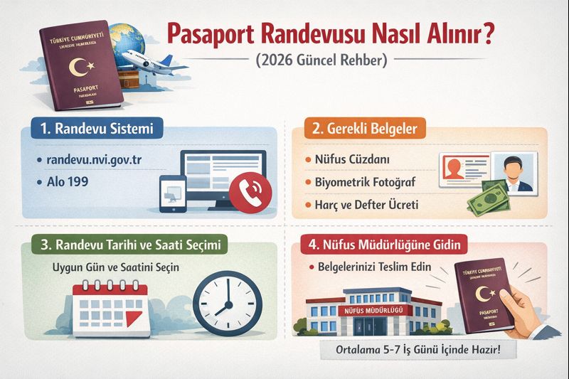 Bu rehberde pasaport randevusu nasıl alınır, başvuru için hangi belgeler gerekir, 2026 pasaport ücretleri ne kadar, çocuklar için başvuruda ne istenir ve başvuru sonrası durum nasıl kontrol edilir gibi en çok aranan sorulara net cevap bulacaksınız.